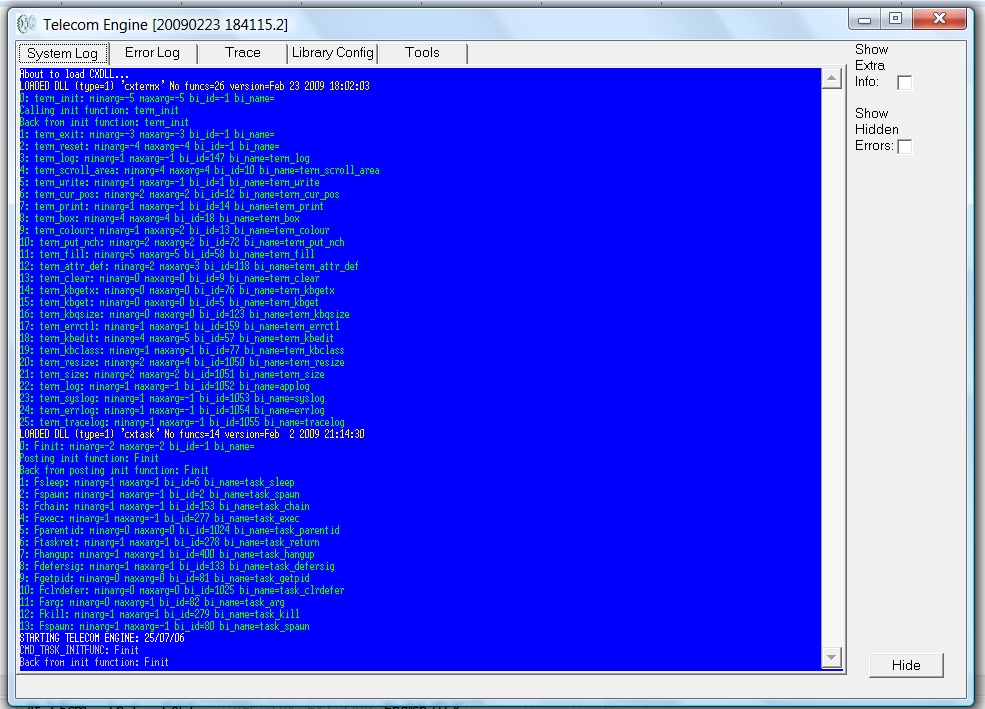 When the GUI front-end (TEX.EXE) is started it first loads the back-end Telecom Engine Libary DLLs that have been specified (either on the command line or in the registry). The initialisation functions for all of these libaries are then called to ensure that the back-end is fully initialised and ready.