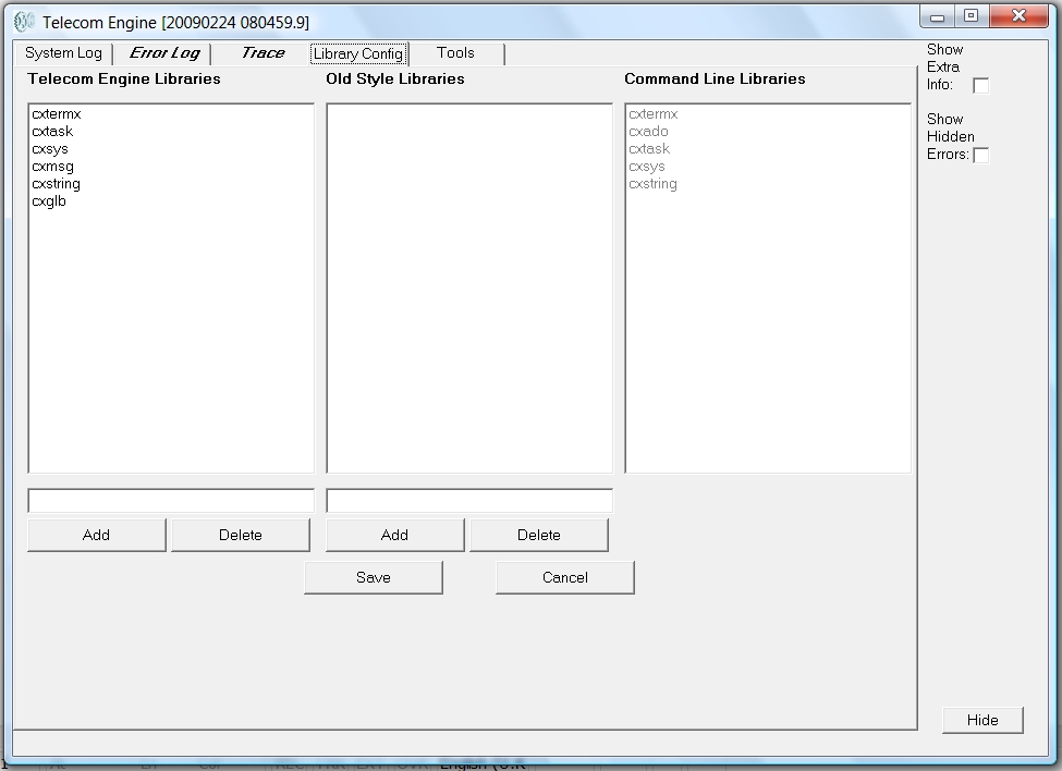 The left pane displays (and allows editing of) the list of back-end Telecom Engine libaries that will be loaded by default upon start-up (unless the -n command line option is specified (see Command Line Options)). The middle pane displays (and allows editing of) the older stlyle Telecom Engine libaries (now depreciated and will possibly be made obsolete in the future). The right hand pane diaplys the libaries that were specified for loading on the command line (using the -r command line option (see Command Line Options)).