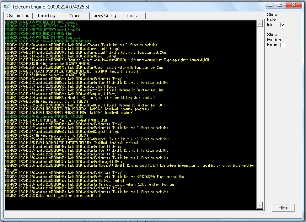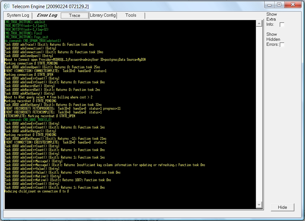 Below is a screen shot showing the trace log scrolling window from a typical run-time session (The trace seen here has been generated by the ActiveX Data Objects (ADO) libary: