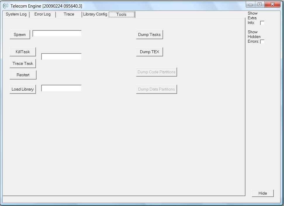 The tools tab provides a few mechanisms for dumping internal Telecom Engine Scheduler information or for manually killing or loading byte-code tasks and manually loading back-end libaries.