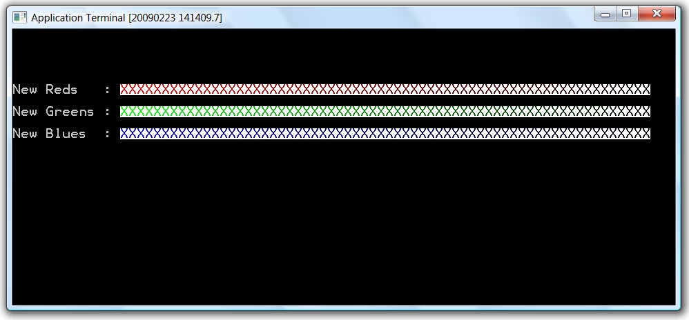 For example, the following program defines in turn 64 different shades of red, green and blue on white (in attributes 0..63) and uses these new attributes to display 64 characters on the screen: